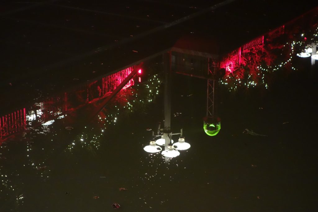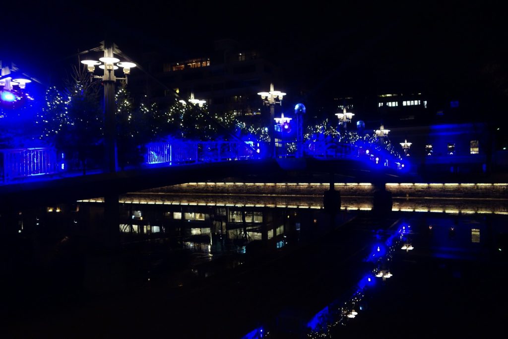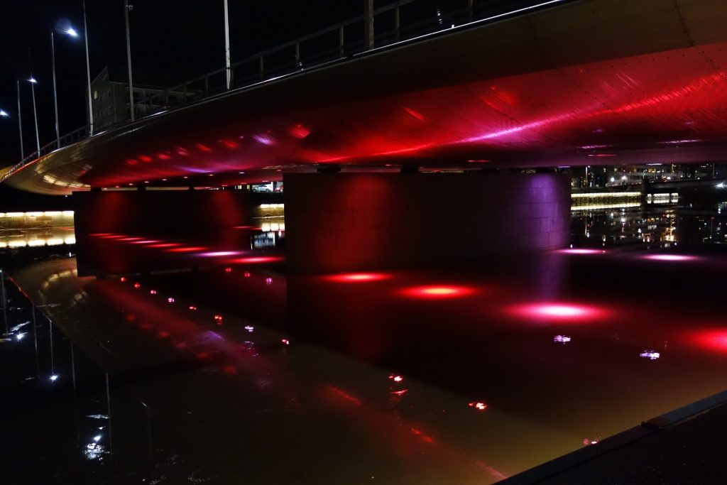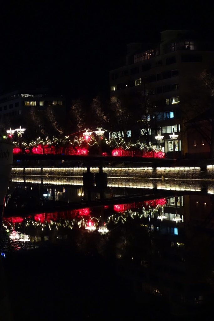 Ja kävelehän aina tänne Myllysillalle saakka. Lentokoneen siipeä muistuttava pohja hohtaa jouluvalaistuksessaan hienosti hyhmäisestä joen pinnasta. Aivan taianomainen tunnelma.