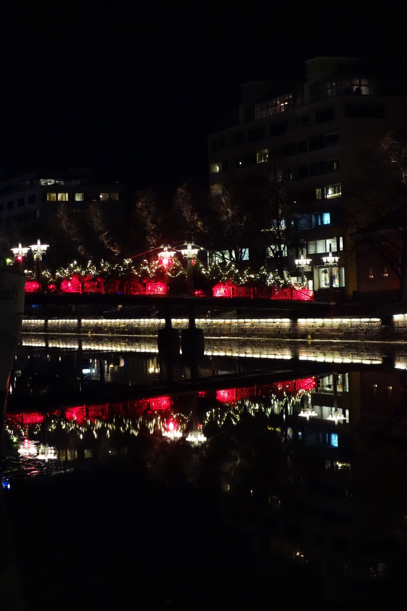 Ja kävelehän aina tänne Myllysillalle saakka. Lentokoneen siipeä muistuttava pohja hohtaa jouluvalaistuksessaan hienosti hyhmäisestä joen pinnasta. Aivan taianomainen tunnelma.