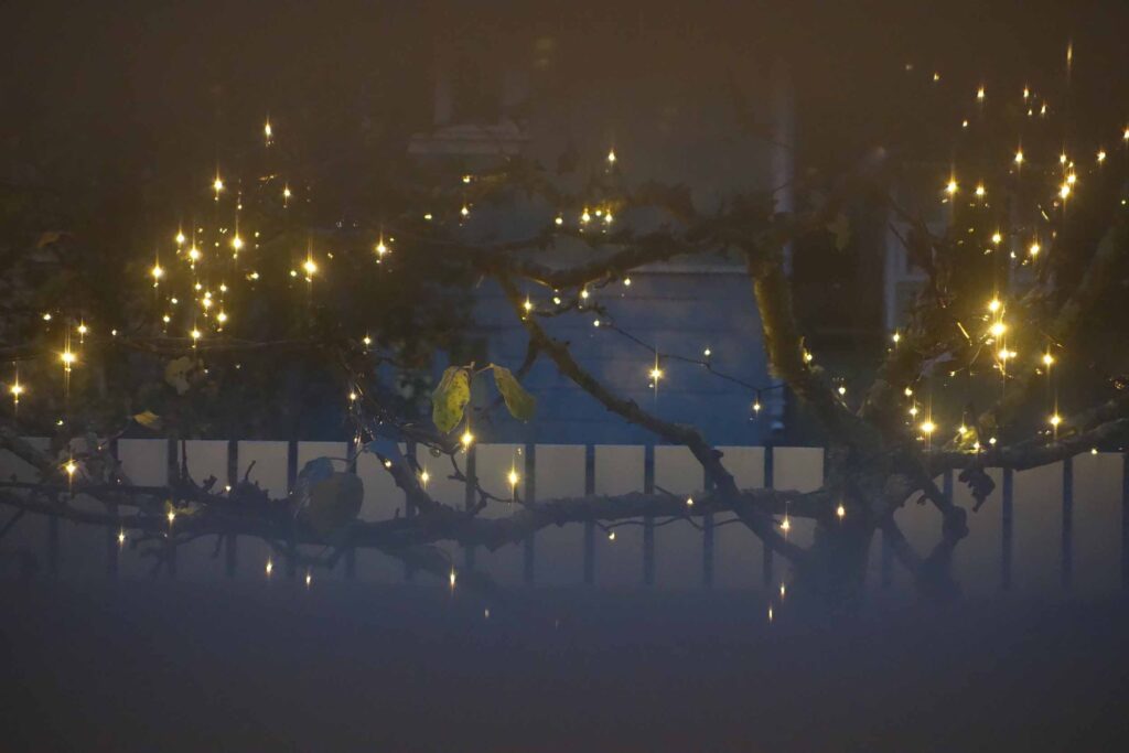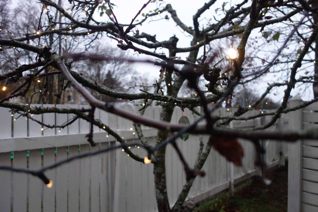 Viime viikonloppuna oli taloyhtiön pihatalkoot, jossa kaikki pudonneet lehdet saivat kyytiä. Viimeisenä tippuvat aina omenapuun lehdet ja kun ne ovat lähteneet, on aika sytyttää valot puuhun. Enkä taaskaan ollut edes ensimmäinen näillä huudeilla, joka pyöritteli jouluvaloja ympäri puuta. Pimeys (ja korona) on tehnyt tehtävänsä – kansa näyttää kaipaavan valoja. Tavallisesti tiukasti kiinni olevia sälekaihtimia pidän nyt hiukan raolla, jotta puun valot tuikkivat kivasti myös sisälle olohuoneeseen. Omenapuun kolmas tähtihetki: ensin kukat, sitten omenat ja nyt vielä valot.