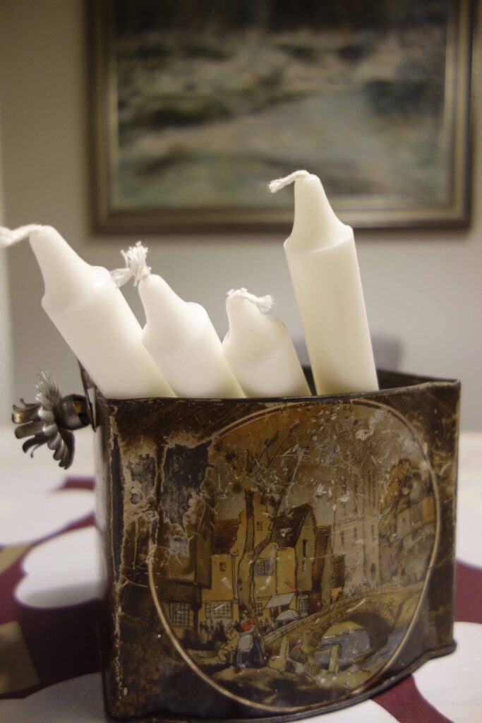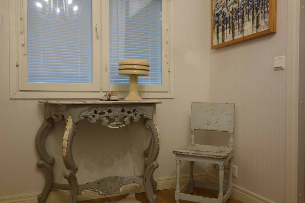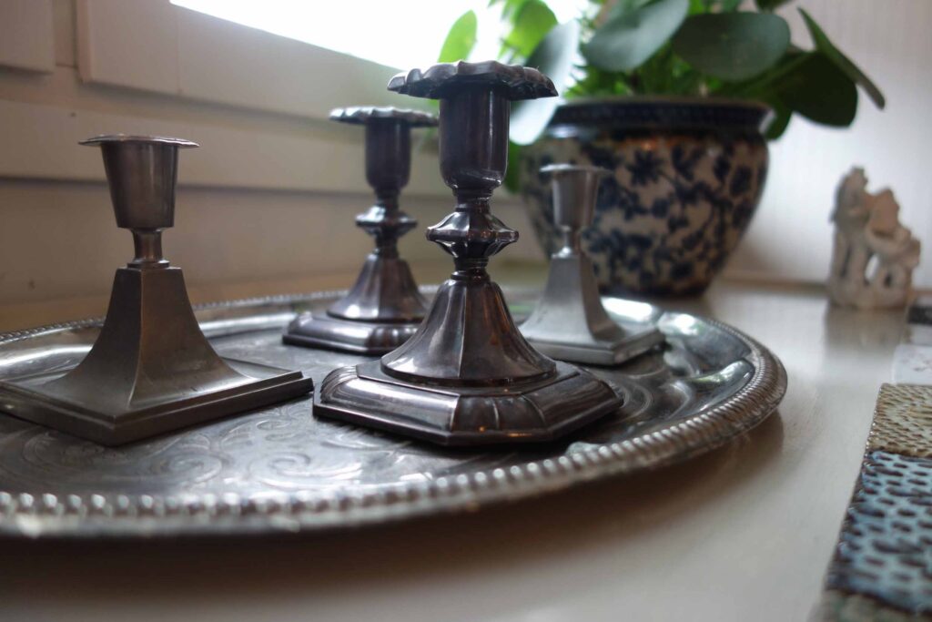 Samalla vaihtuivat läpikuultavat pullot ja muut lasiesineet olohuoneen ikkunalta metallisiin kynttilänjalkoihin, jotka saavat tosin vielä odottaa tovin kynttilöitä. Usein poltamme vain yhtä kynttilää kerrallaan Balmuirin lyhdyssä, joka seilaa sitten eri huoneiden välillä riippuen, missä kulloinkin hengataan. Yhdessäkin kynttilässä riittää katseltavaa… Lepattava liekki, virtaava vesi ja nukkuvan lapsen kasvot – niitä on aina rauhoittava katsella. Sähkökynttelikön nostan ikkunalle ehkä ensi viikonloppuna…