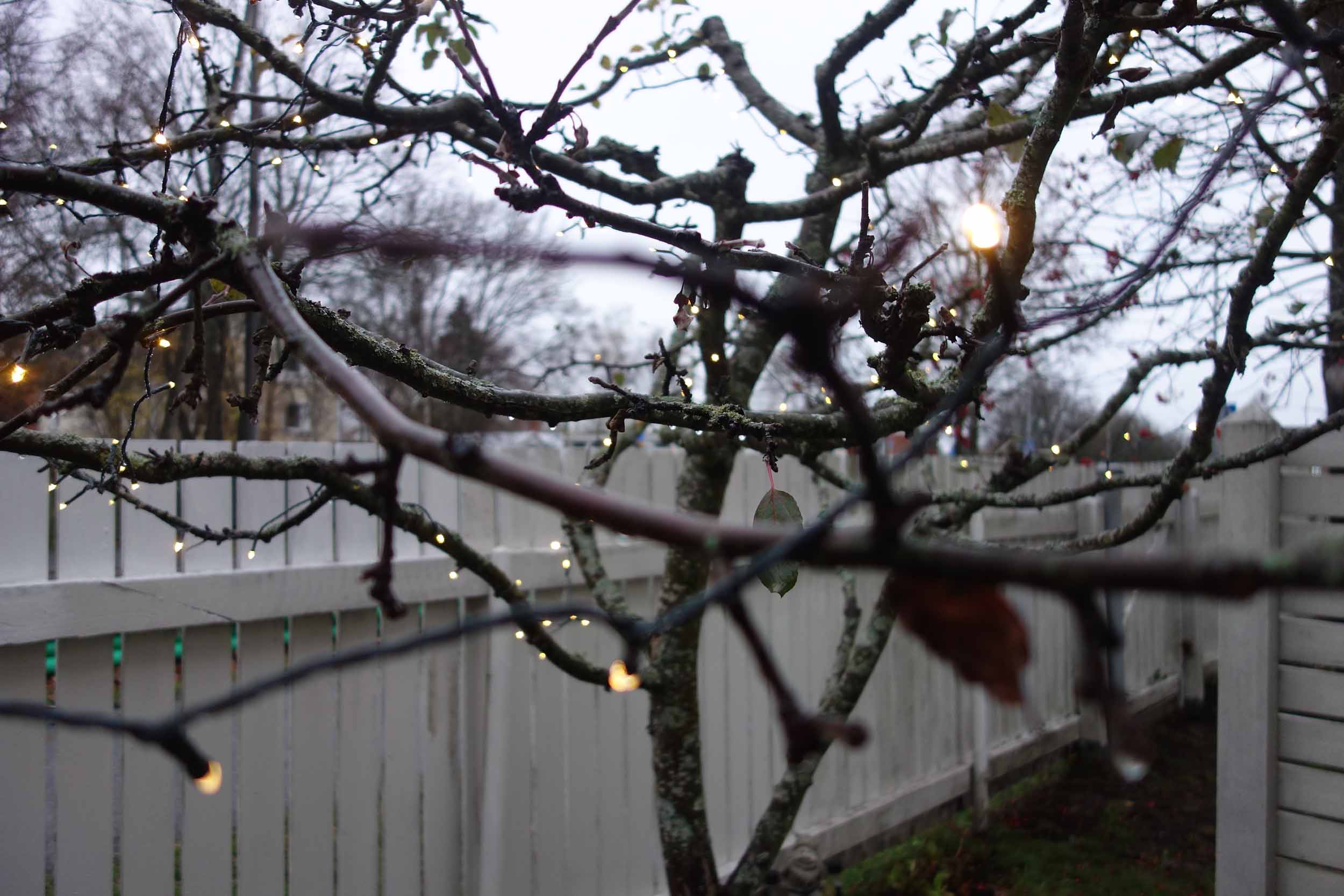 Outdoor lighting on our apple tree and it is the star of our back yard  once again.