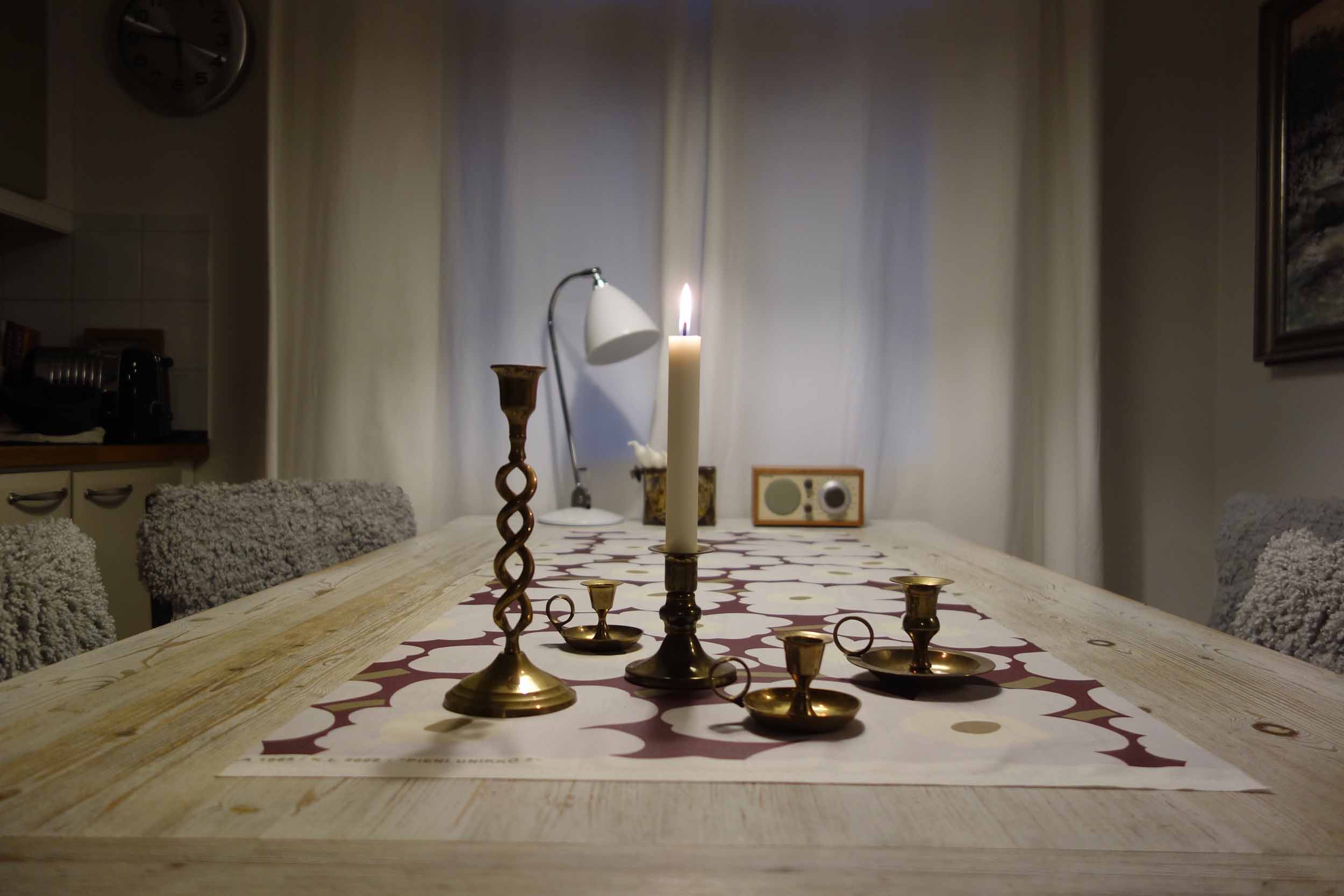 Samalla vaihtuivat läpikuultavat pullot ja muut lasiesineet olohuoneen ikkunalta metallisiin kynttilänjalkoihin, jotka saavat tosin vielä odottaa tovin kynttilöitä. Usein poltamme vain yhtä kynttilää kerrallaan Balmuirin lyhdyssä, joka seilaa sitten eri huoneiden välillä riippuen, missä kulloinkin hengataan. Yhdessäkin kynttilässä riittää katseltavaa… Lepattava liekki, virtaava vesi ja nukkuvan lapsen kasvot – niitä on aina rauhoittava katsella. Sähkökynttelikön nostan ikkunalle ehkä ensi viikonloppuna…