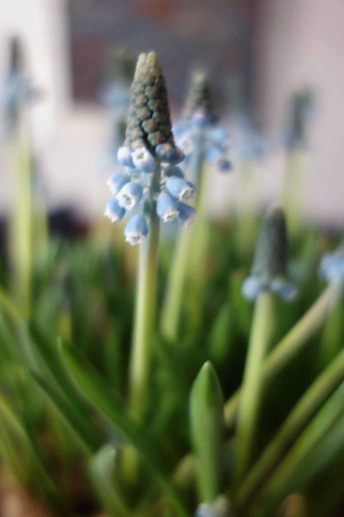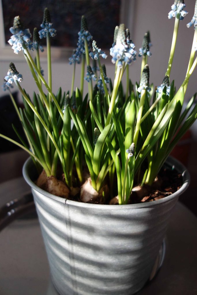 Ensimmäinen setti helmililjoja on sulostuttanut olohuonettamme. Sälekaihtimien läpi siivilöityvä valo puolestaan ilostuttanut ja saanut meidät kevätfiiliksiin.